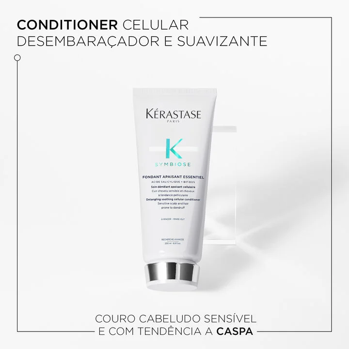 Symbiose Fondant Apaisant Essentiel da Kérastase é um condicionador anticaspa calmante, com ação desembaraçante, sem sulfato e sem silicone para couro cabeludo sensível, com tendência a caspa. Contém ácido salicílico para um couro cabeludo mais leve e bifidus para um couro cabeludo saudável. Uma fórmula hidratante para aliviar desconfortos e preservar a barreira do couro cabeludo. Cuidado intenso, porém, leve para o couro cabeludo e comprimento do cabelo. Reduz a sensibilidade do couro cabeludo desde a 1ª aplicação e aumenta a vitalidade do cabelo ao longo do tempo* O Fondant Apaisant Essentiel tem uma textura balsâmica branca bastante sensorial e luxuosa combinada com uma fragrância fina e luxuosa .
